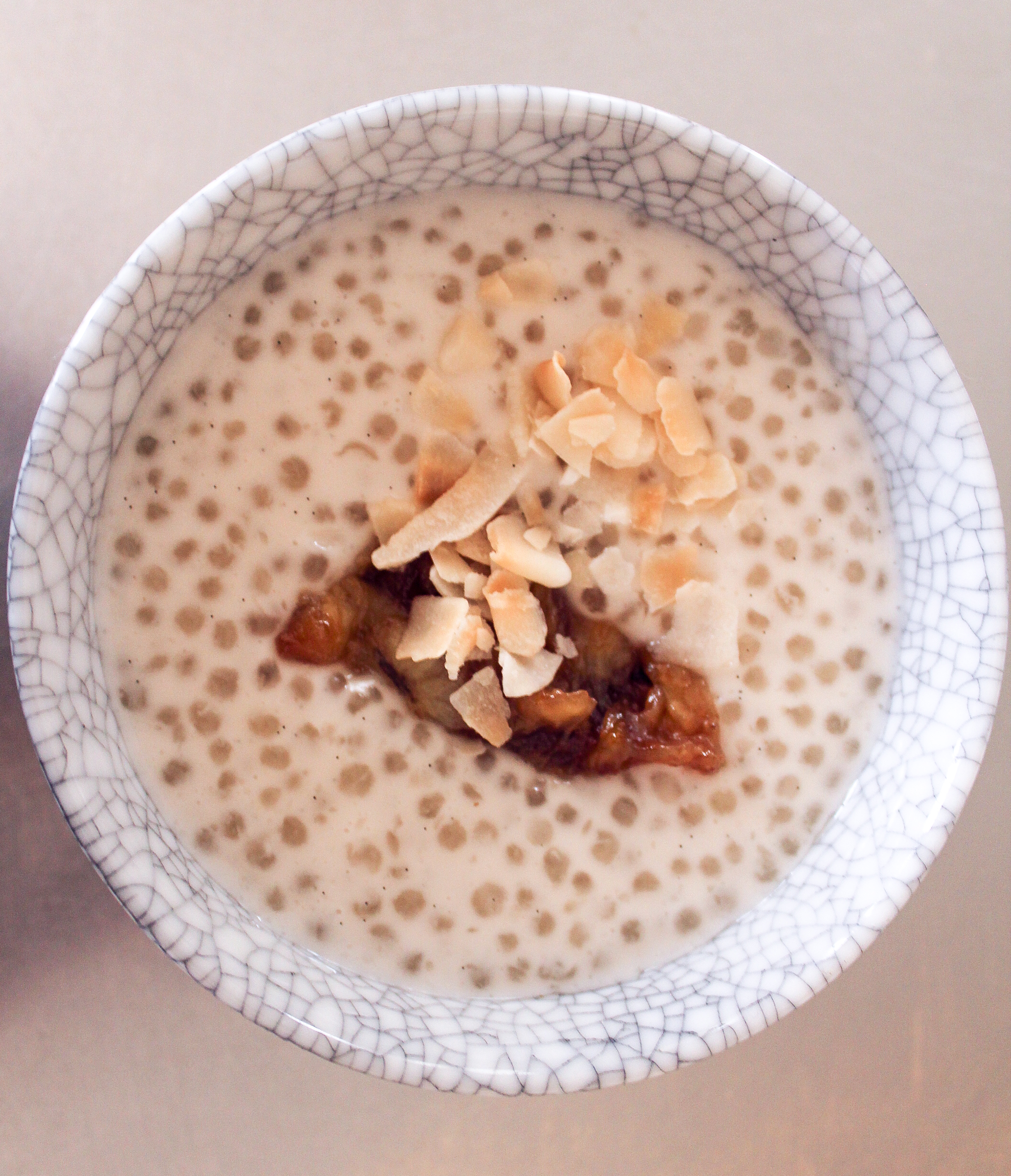 I must admit, I was initially sceptical about how the clear, pearly tapioca seeds would taste once transformed into a ‘pudding’, but now I’m completely sold to this magical little food. Once boiled in water, tapioca thickens wonderfully and in this recipe, it is flavoured with coconut cream, vanilla and a touch of maple syrup. The result is a comfortingly creamy, slightly sweet and just plain yummy dessert, not too dissimilar in taste and texture to rice pudding. The addition of caramelised bananas provides the satisfaction of something sweeter, but could easily be replaced with fresh stone fruits or berries. I had leftover cold pudding with plums this morning, and it was delicious. Finished off with crunchy toasted coconut chips, this dish is just rich enough, just sweet enough, and just filling enough to be absolutely satisfying. I bought coconut chips that had already been toasted, but you could easily do this yourself by coating the chips in a fine sprinkle of caster sugar, then toasting them in the oven at 180°C/350°F for 5-10 minutes until slightly browned.