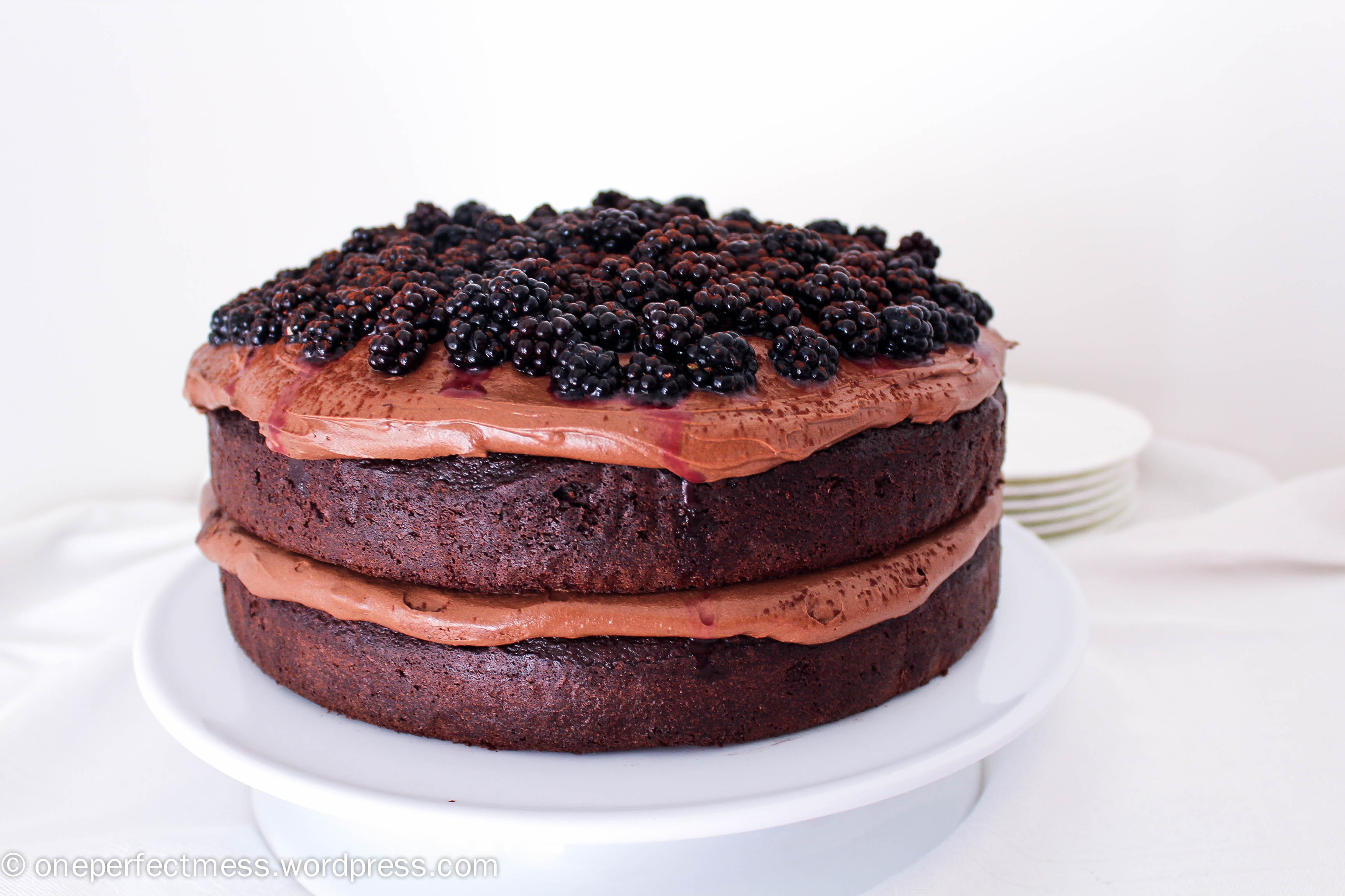 This is a monster for chocolate lovers; layers of rich, moist, chocolate buttermilk cake held together in a delicious embrace by a thick, velvety, dark chocolate cream cheese frosting, topped off with fresh juicy blackberries! The cream cheese frosting is decadent, but its slight tang provides the perfect offset to the rich, chocolatey sweetness of the cake itself. And I just love blackberries…I summoned my inner jungle girl and went crawling through a dense forest near my house to pick a whole container-full of these bad boys. I came back with some pretty severe war wounds down my legs and arms, but it was so worth it.