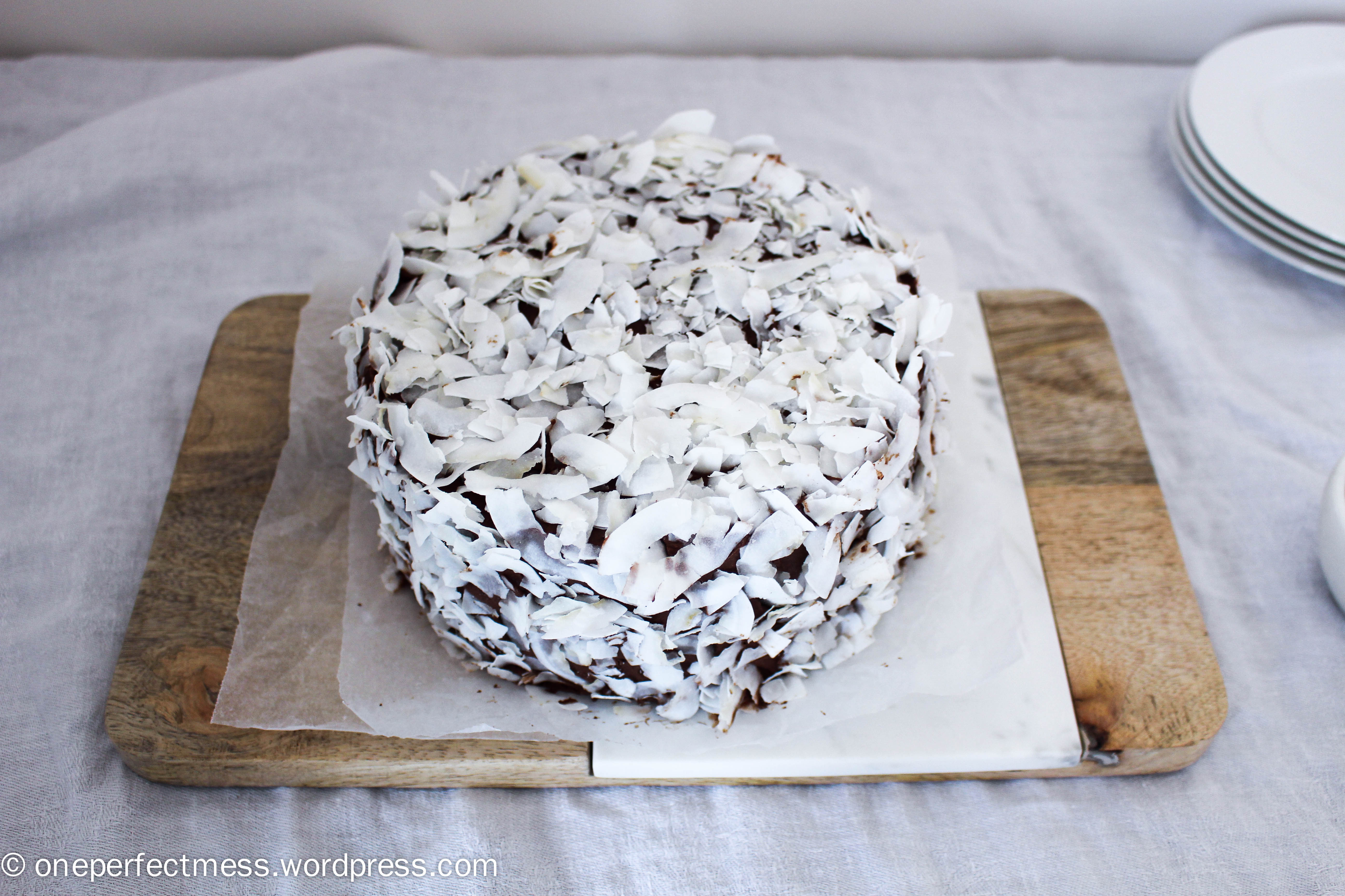 - Dollop the remaining frosting on the top surface of the cake, spreading it evenly across the top and down the sides until relatively smooth. Gently press handfuls of coconut flakes into the frosting. If the frosting is a little sloppy, refrigerate for 20 minutes to firm up.