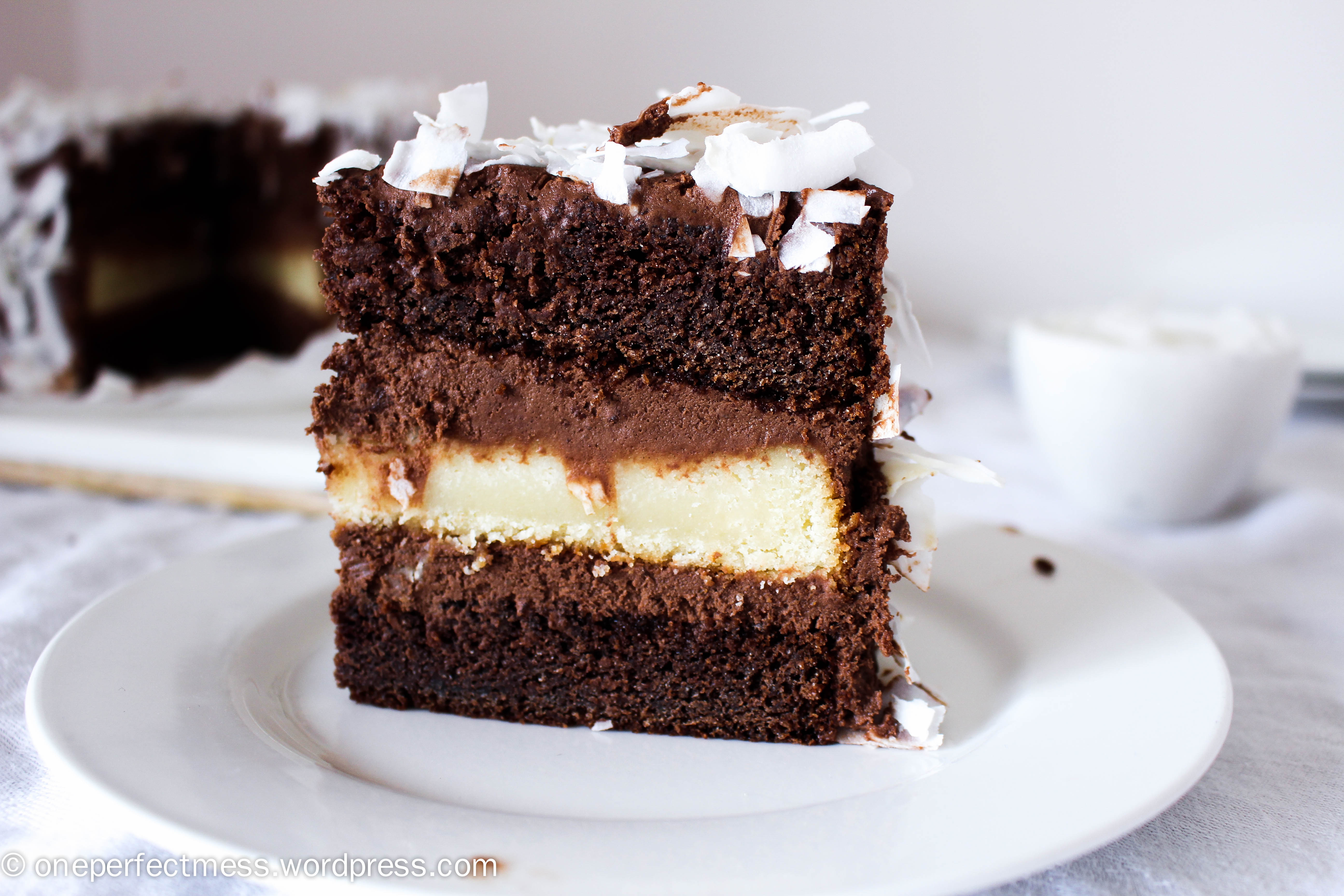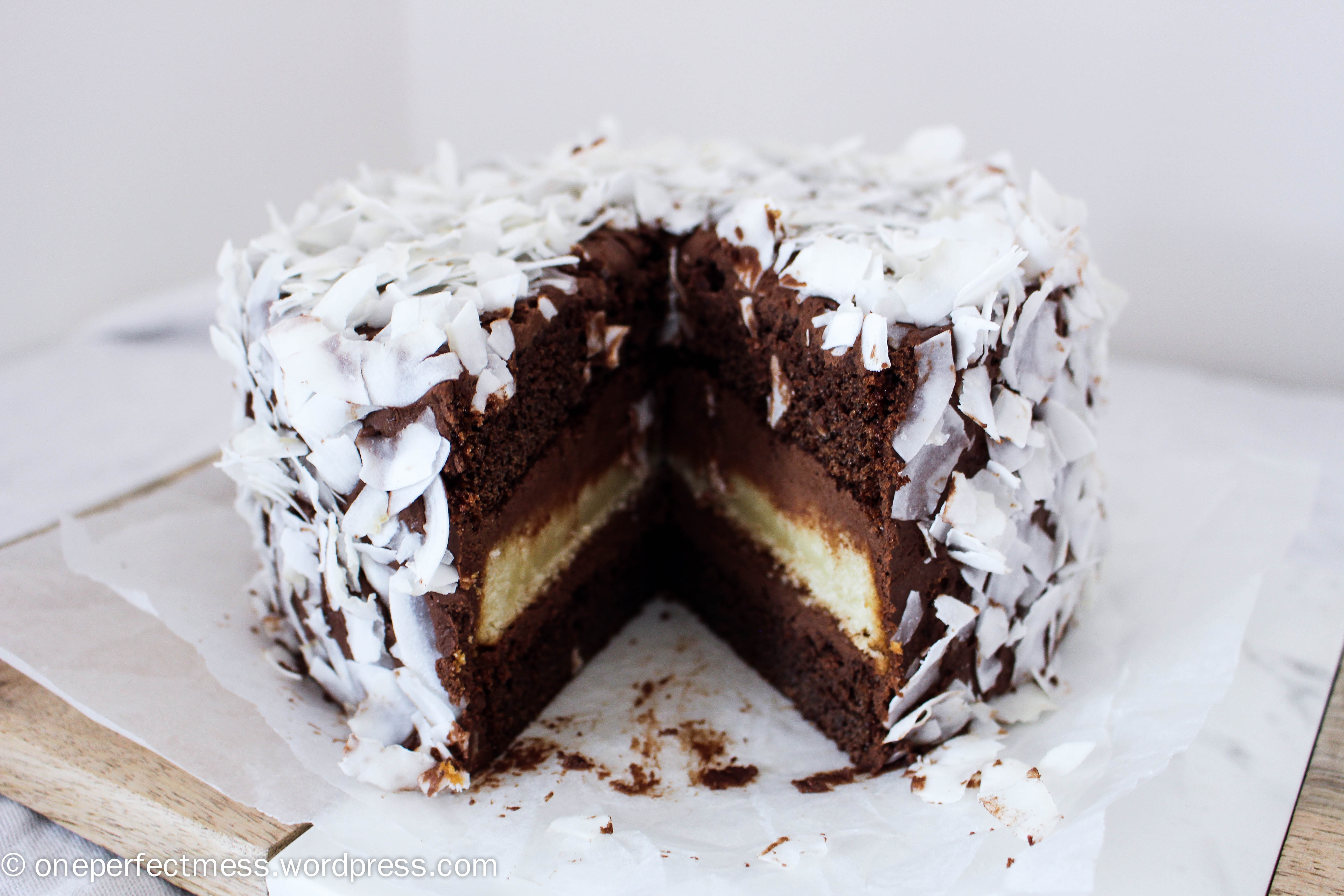 - Secure one chocolate cake layer onto your plate with a dollop of frosting. Spread 1/4 of the frosting onto the first cake layer, then press the coconut cake gently on top. Spread another 1/4 of the frosting over the coconut cake, and top with the second chocolate cake.