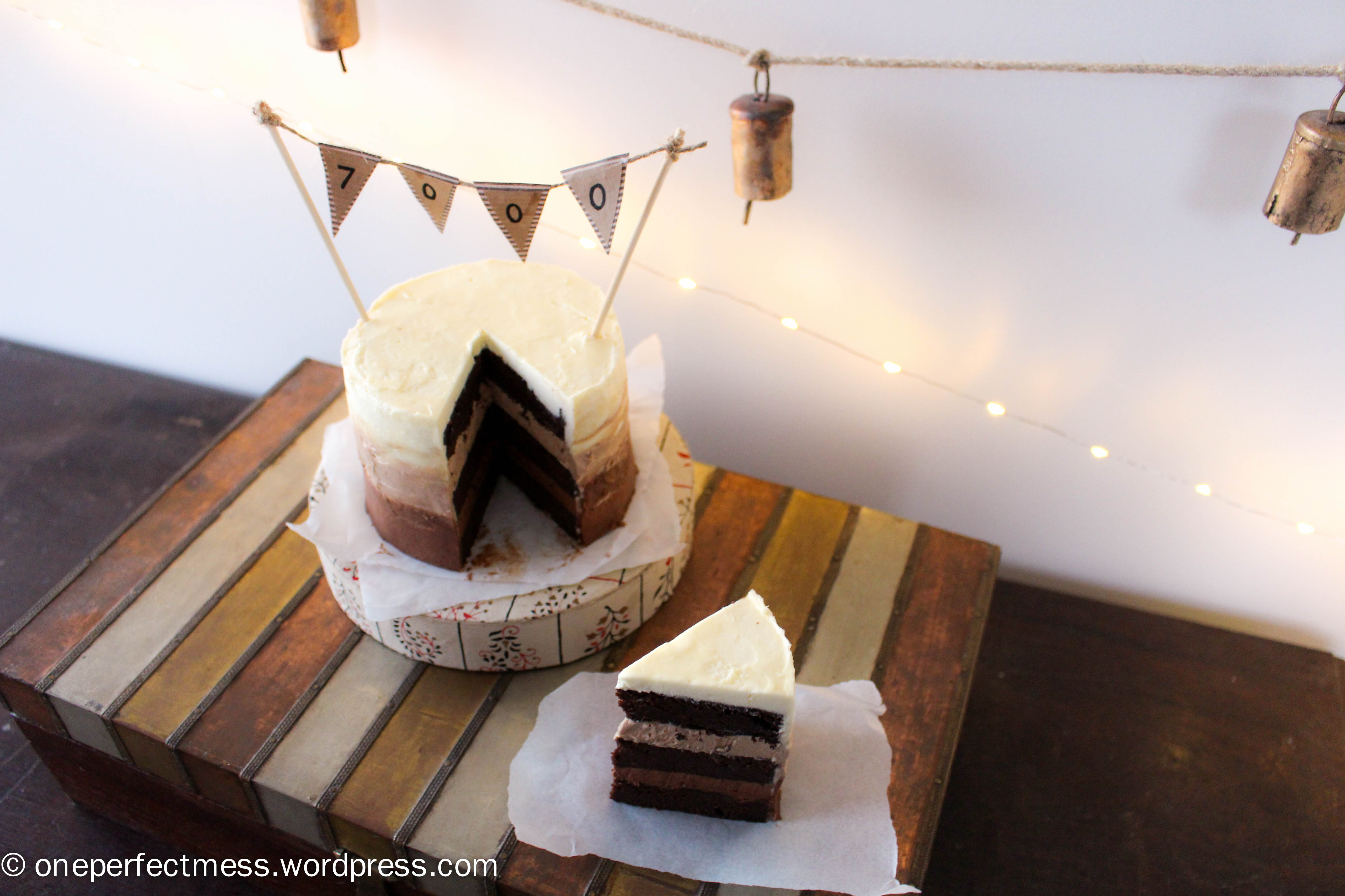 7000 views later and a small but swanky little creation to celebrate; three layers of fudgey, rich, chocolate buttermilk cake, stacked between slatherings of silky chocolate swiss meringue buttercream. If there’s one thing I enjoy more than chocolate swiss meringue buttercream, it’s a collaboration of white, milk and dark chocolate swiss meringue buttercream all in the one cake. The buttermilk cake is soft and moist, and has very little sugar and lots of cocoa so is quite intense, perfectly offsetting the sweetness of the frosting.