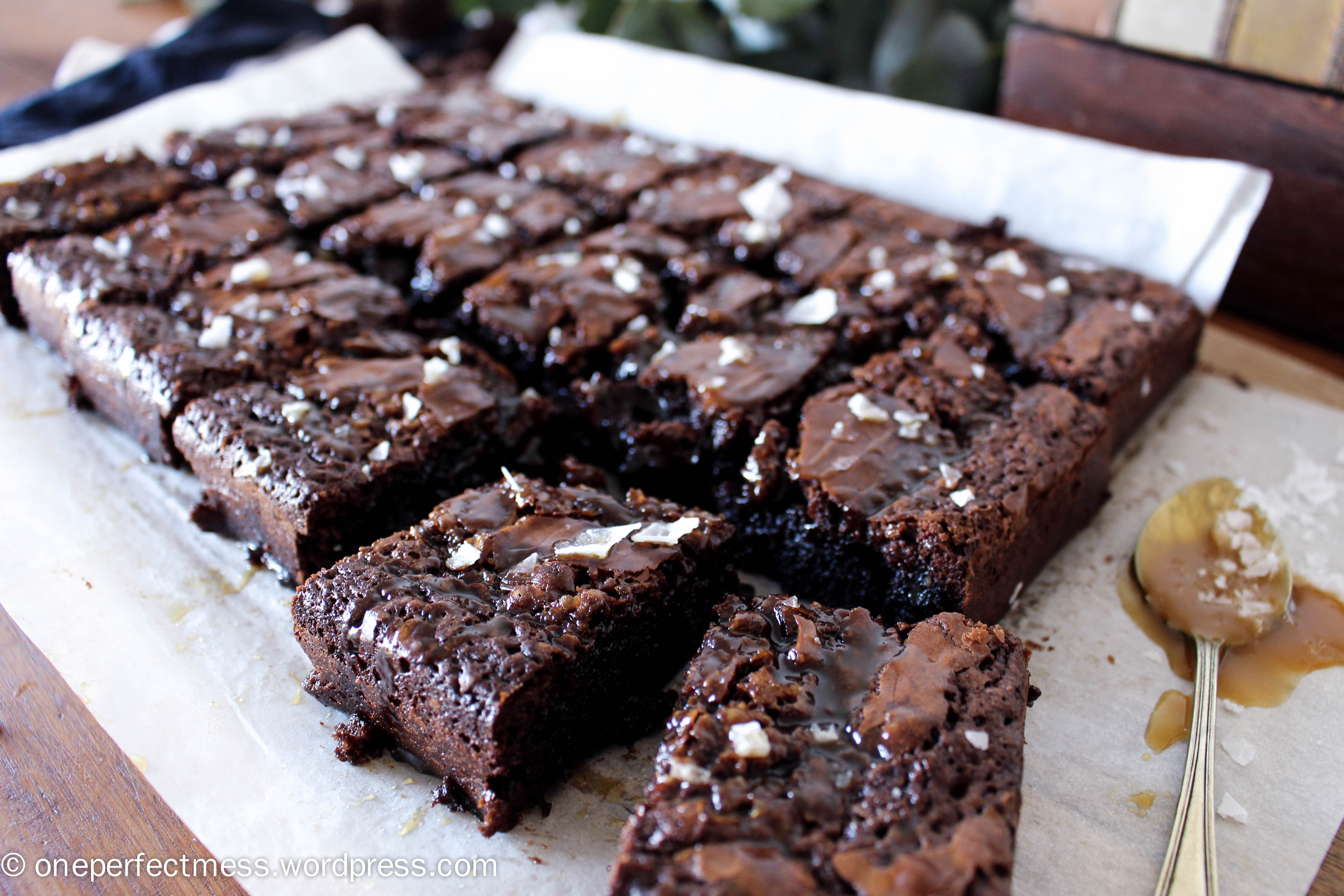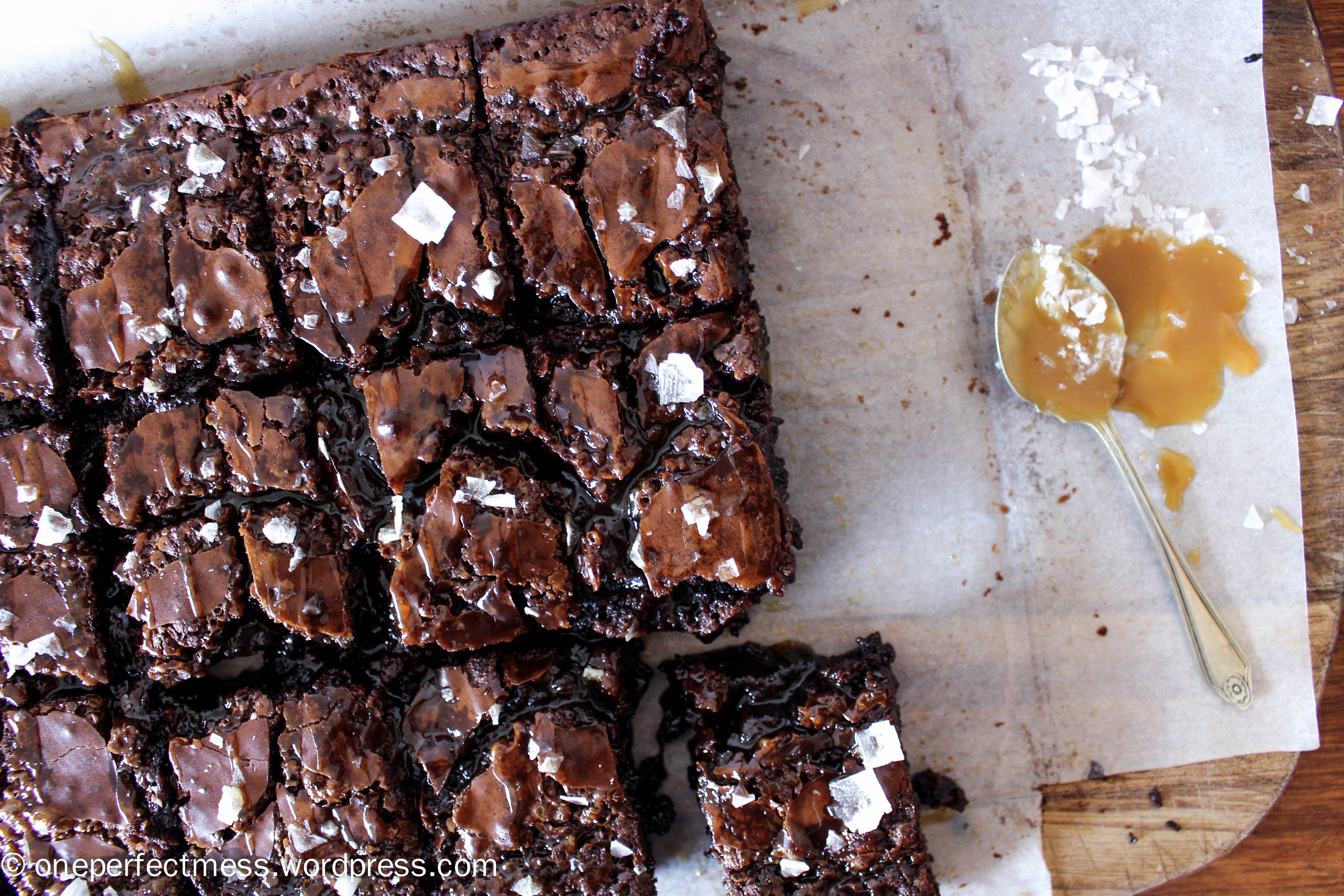Hello you. Yes, you. I know you can’t take your eyes off me. I’m rich, warm and utterly irresistible, and I’m begging you to just take a bite…I’m certainly not a treat for the faint-hearted. If you allow yourself to indulge, you’ll first encounter a trace of salt that just touches your lips as your discover a drizzle of thick, velvety caramel nestled on my surface. Then, your teeth will overcome gentle resistance from my crisp surface before collapsing into a deep, thick, chocolatey mouthful of brownie bliss. The room will become hazy as a seductive combination of sugar and salt enrapture your senses, and you’ll be licking your lips and gazing longingly at your second bite before you’ve finished your first. And that’s ok, because there’s plenty of me to enjoy. I can be yours, tonight, if you’ll just whip out that apron and mixing bowl and spend a sweet hour in the kitchen. Oh, and any leftover salted caramel sauce can by drizzled generously over icecream… Tempting?
