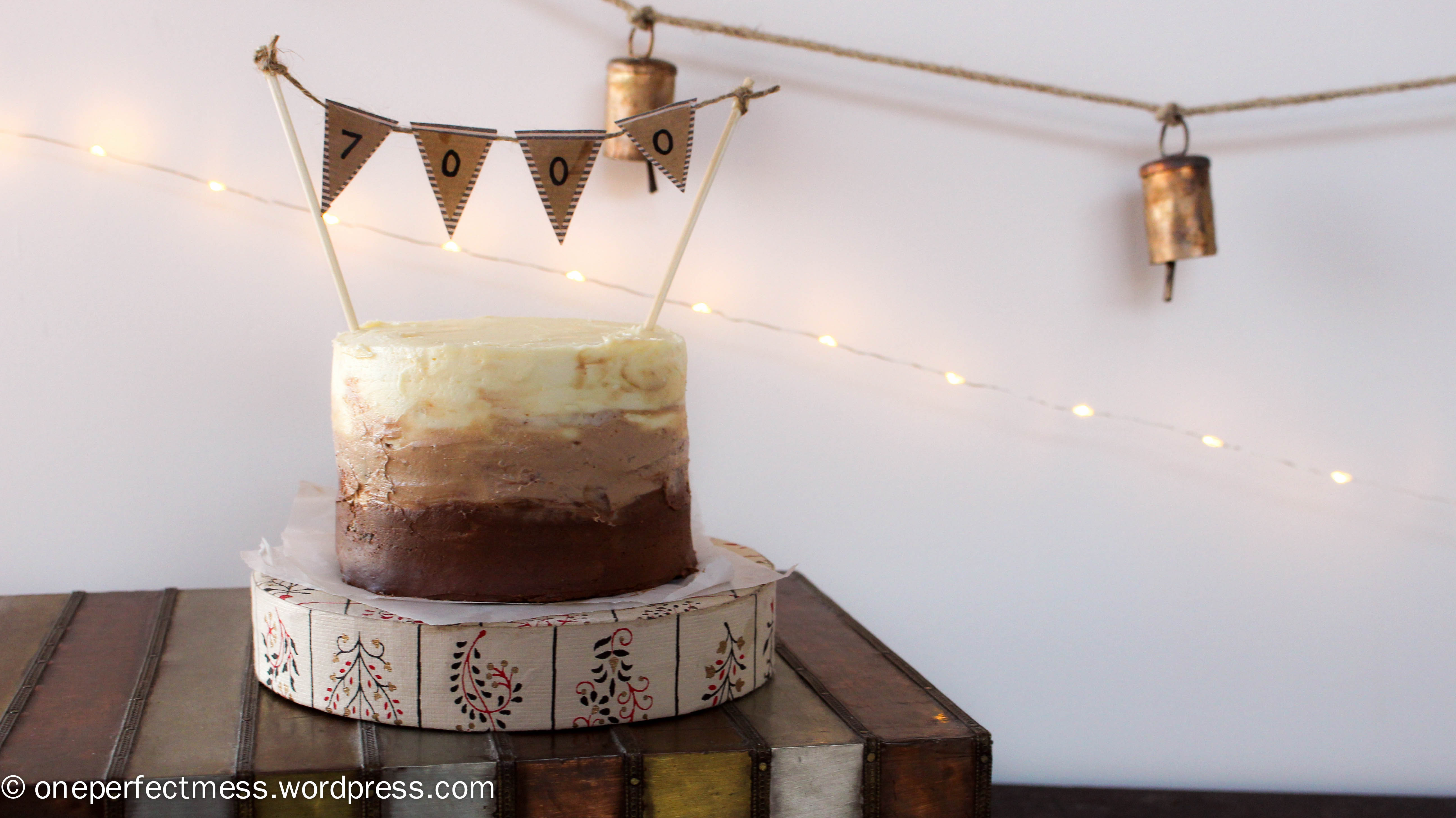 7000 views later and a small but swanky little creation to celebrate; three layers of fudgey, rich, chocolate buttermilk cake, stacked between slatherings of silky chocolate swiss meringue buttercream. If there’s one thing I enjoy more than chocolate swiss meringue buttercream, it’s a collaboration of white, milk and dark chocolate swiss meringue buttercream all in the one cake. The buttermilk cake is soft and moist, and has very little sugar and lots of cocoa so is quite intense, perfectly offsetting the sweetness of the frosting.